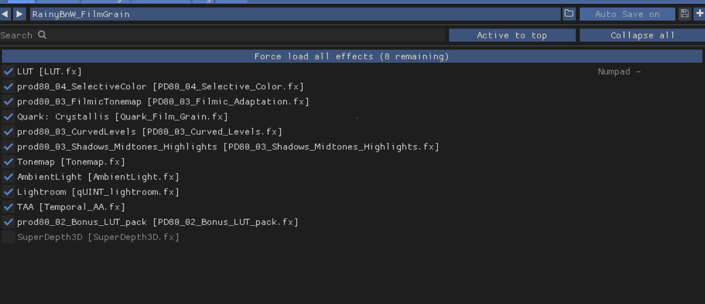 Make sure the followed effects are enabled ( for the 2 versions without filmgrain, Quark FX will not be checked).