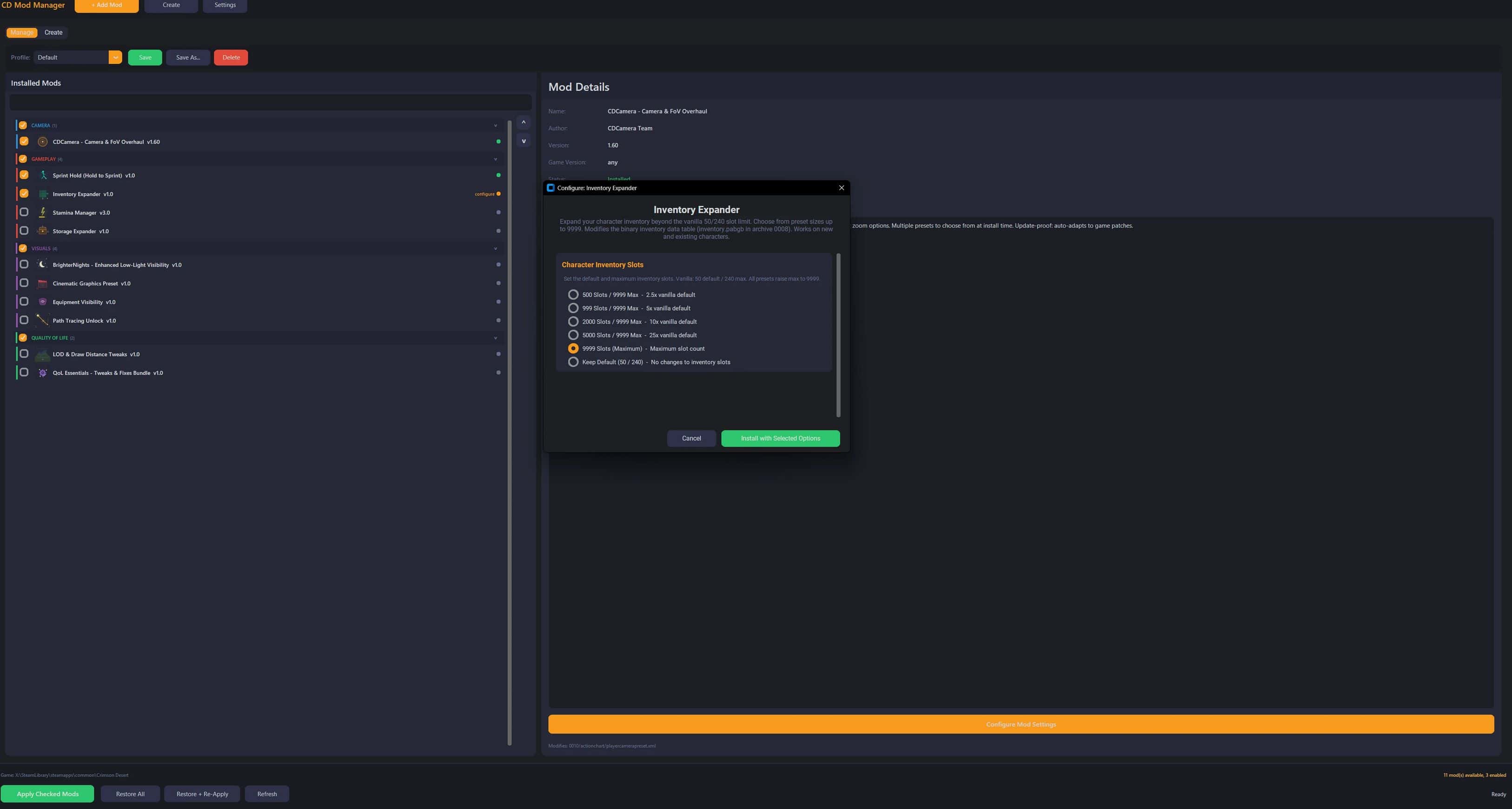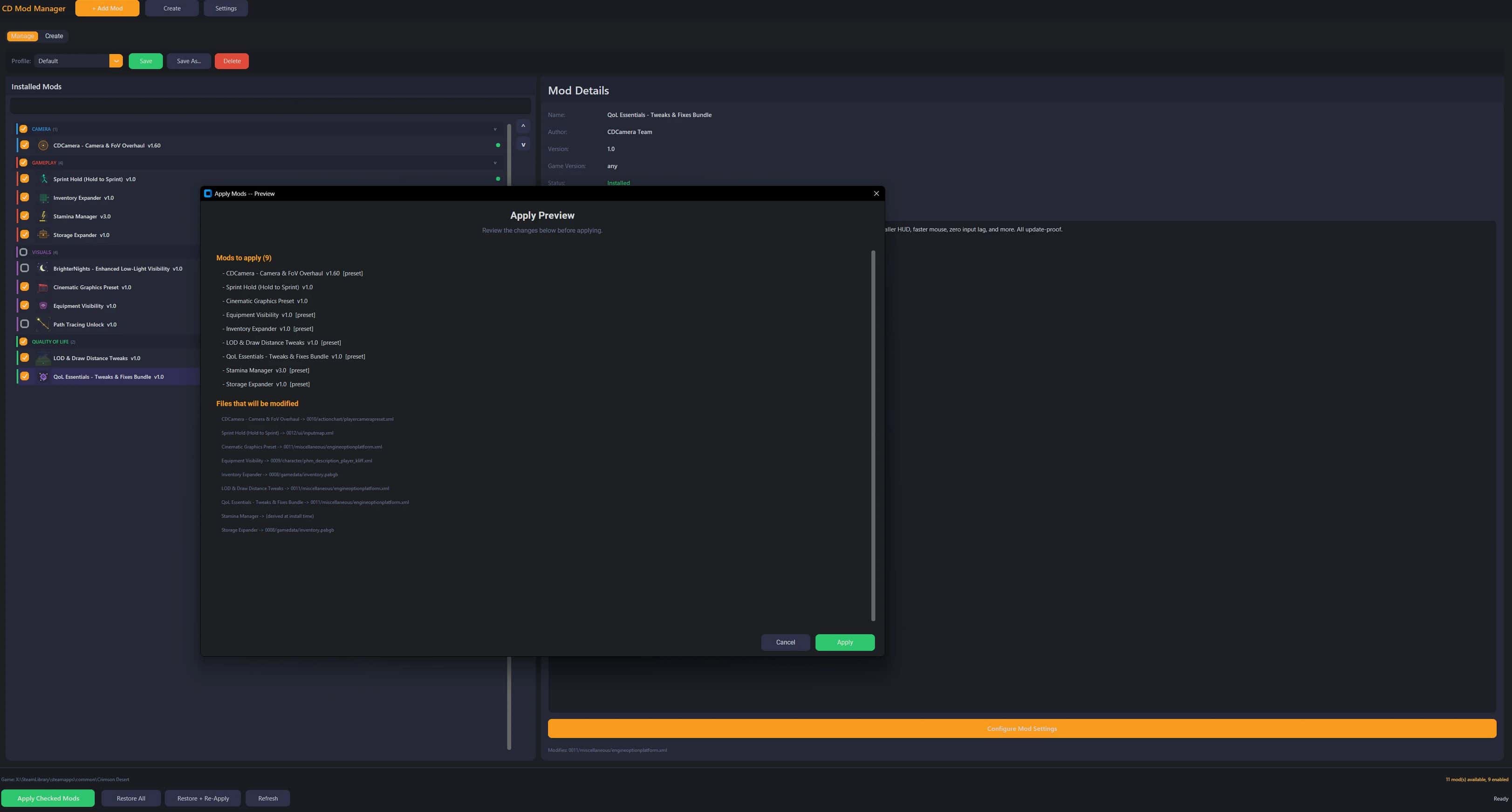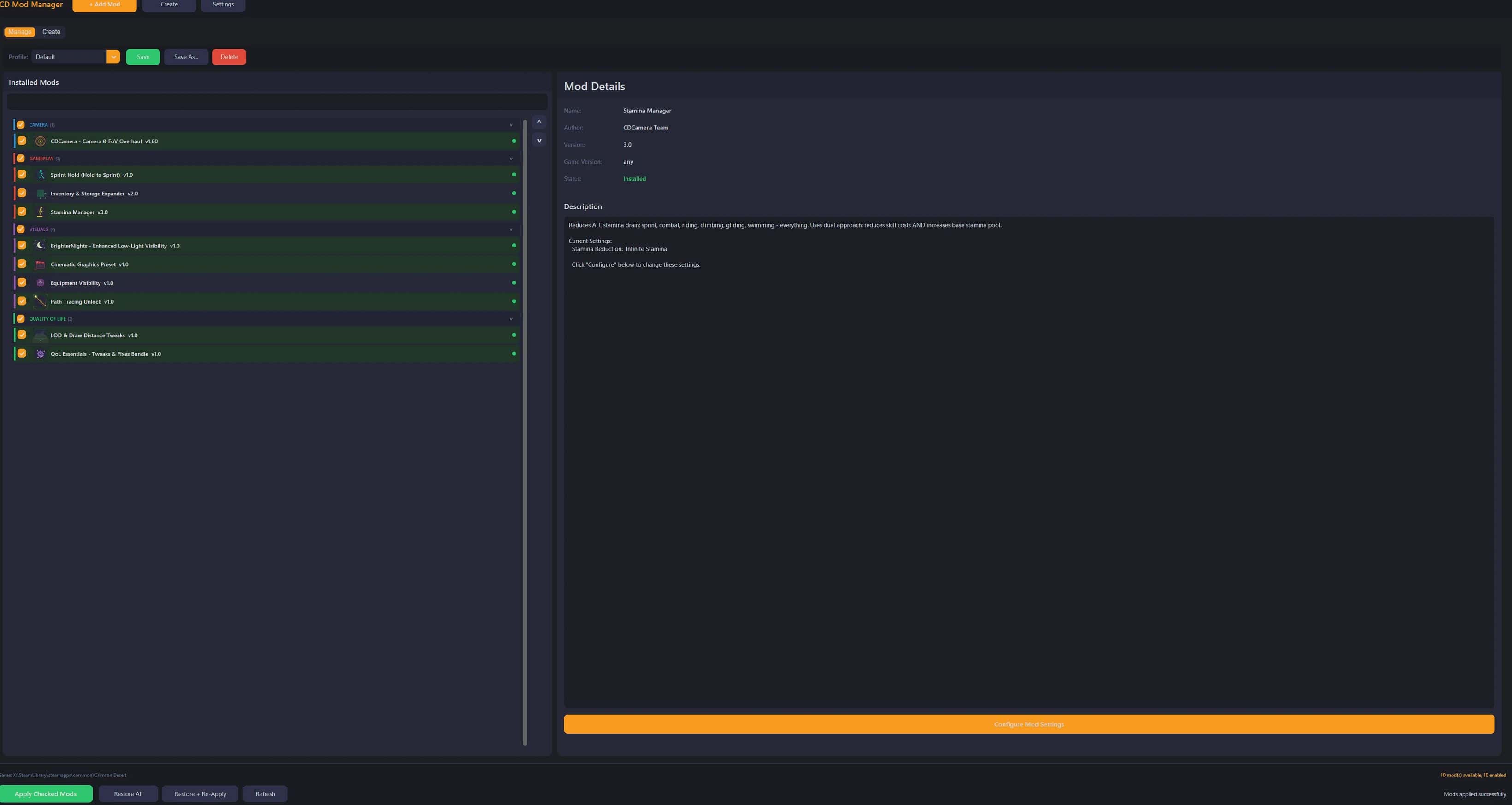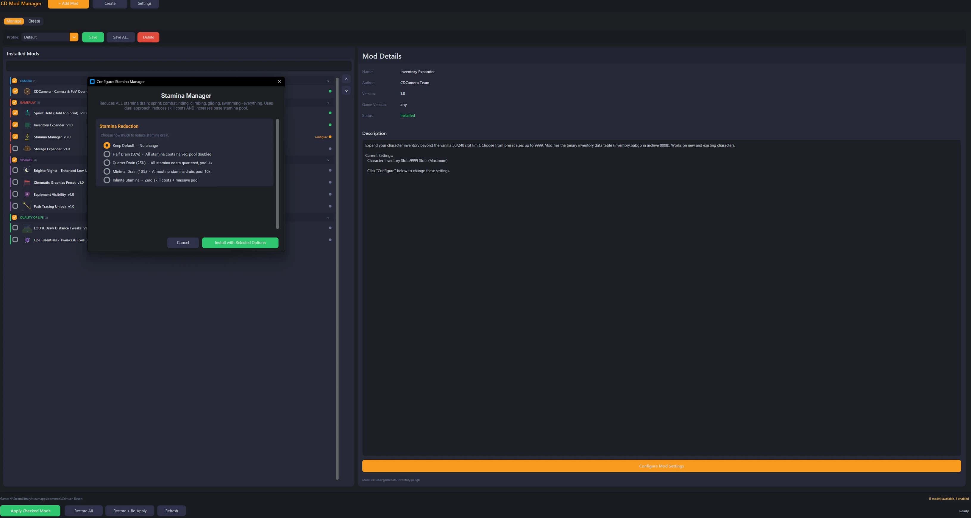 The first universal mod manager for Crimson Desert. Comes pre-loaded with the most requested QoL mods, all configurable with step-by-step preset dialogs.