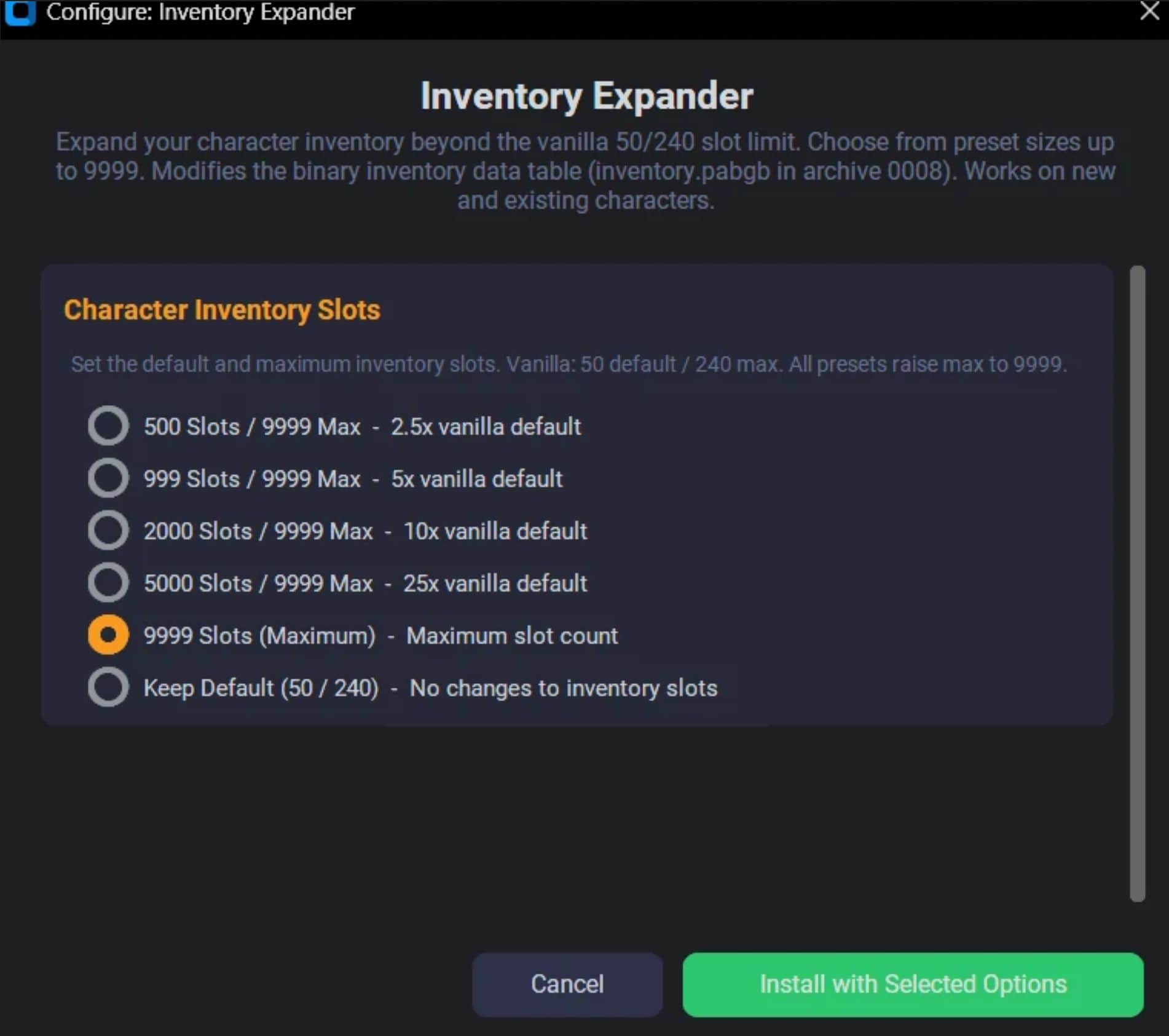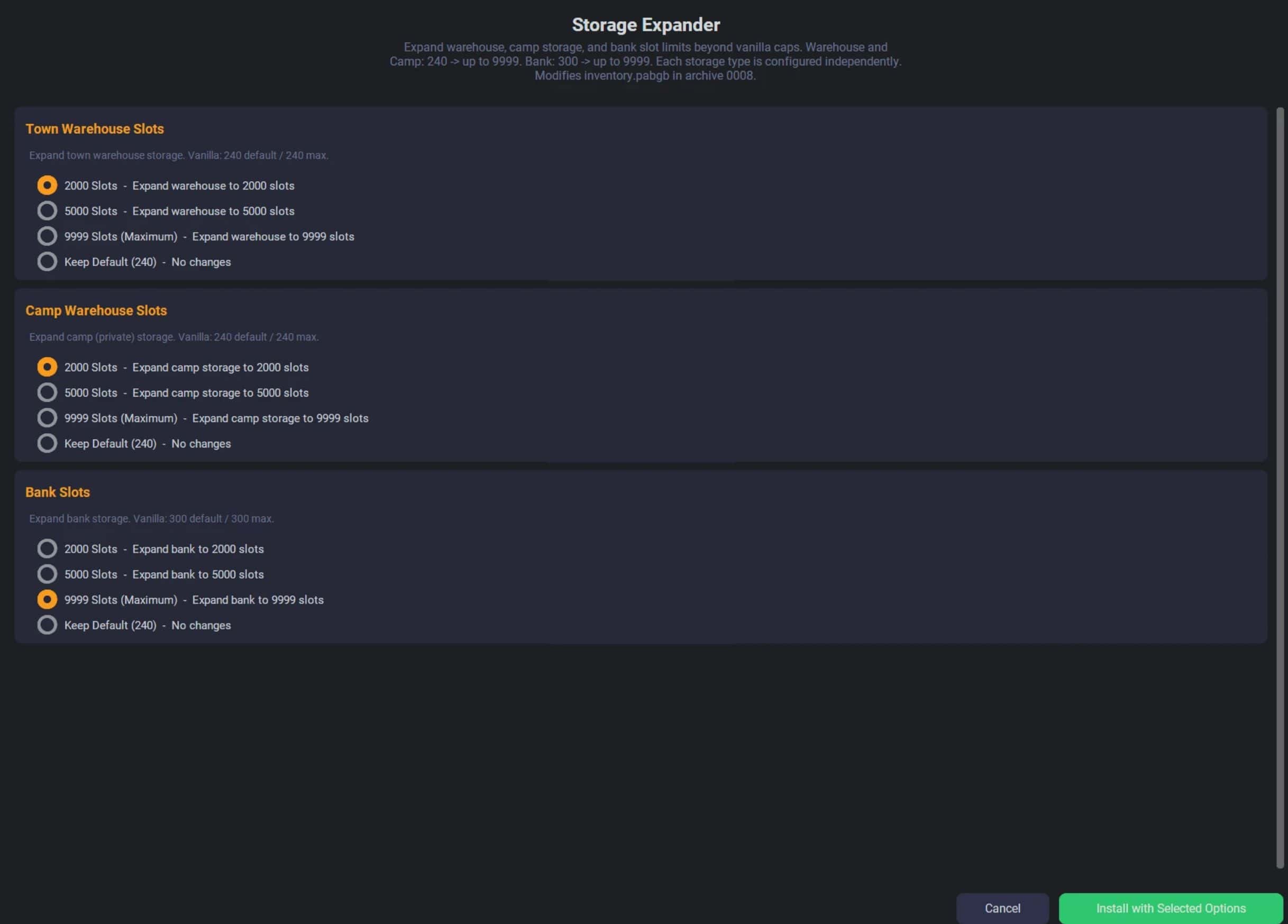 – Increase warehouse, camp chest, and bank storage: up to 9999 slots each.