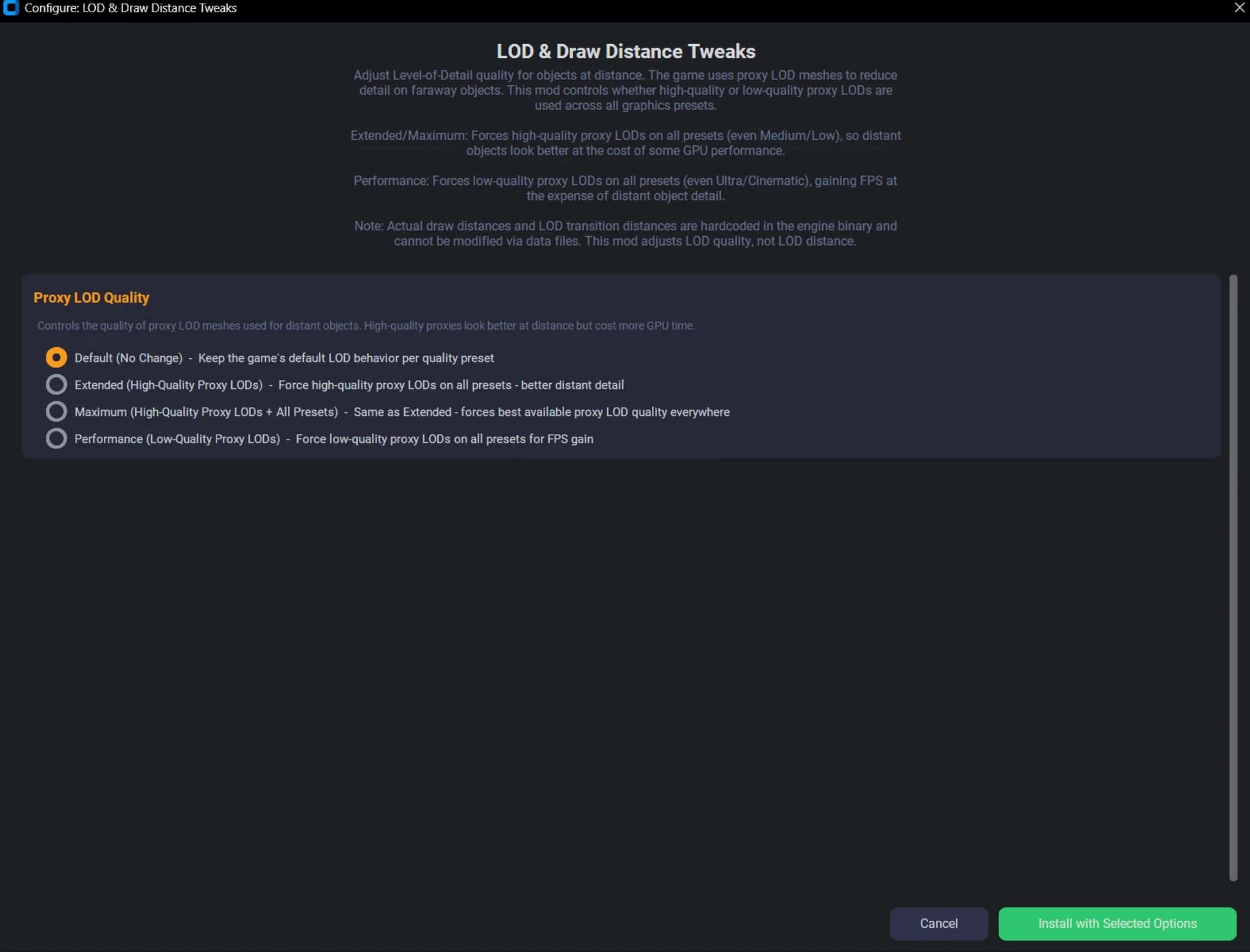 – Pushes ALL 11 quality settings to the hidden Cinematic tier. Vanilla “Ultra” caps Lighting, Water, and Volumetric Fog at “High” – this unlocks the real maximum.