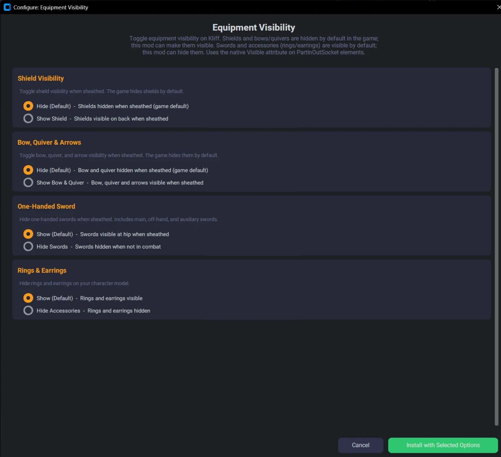 – Show or hide shields, bows, swords, and accessories when sheathed.