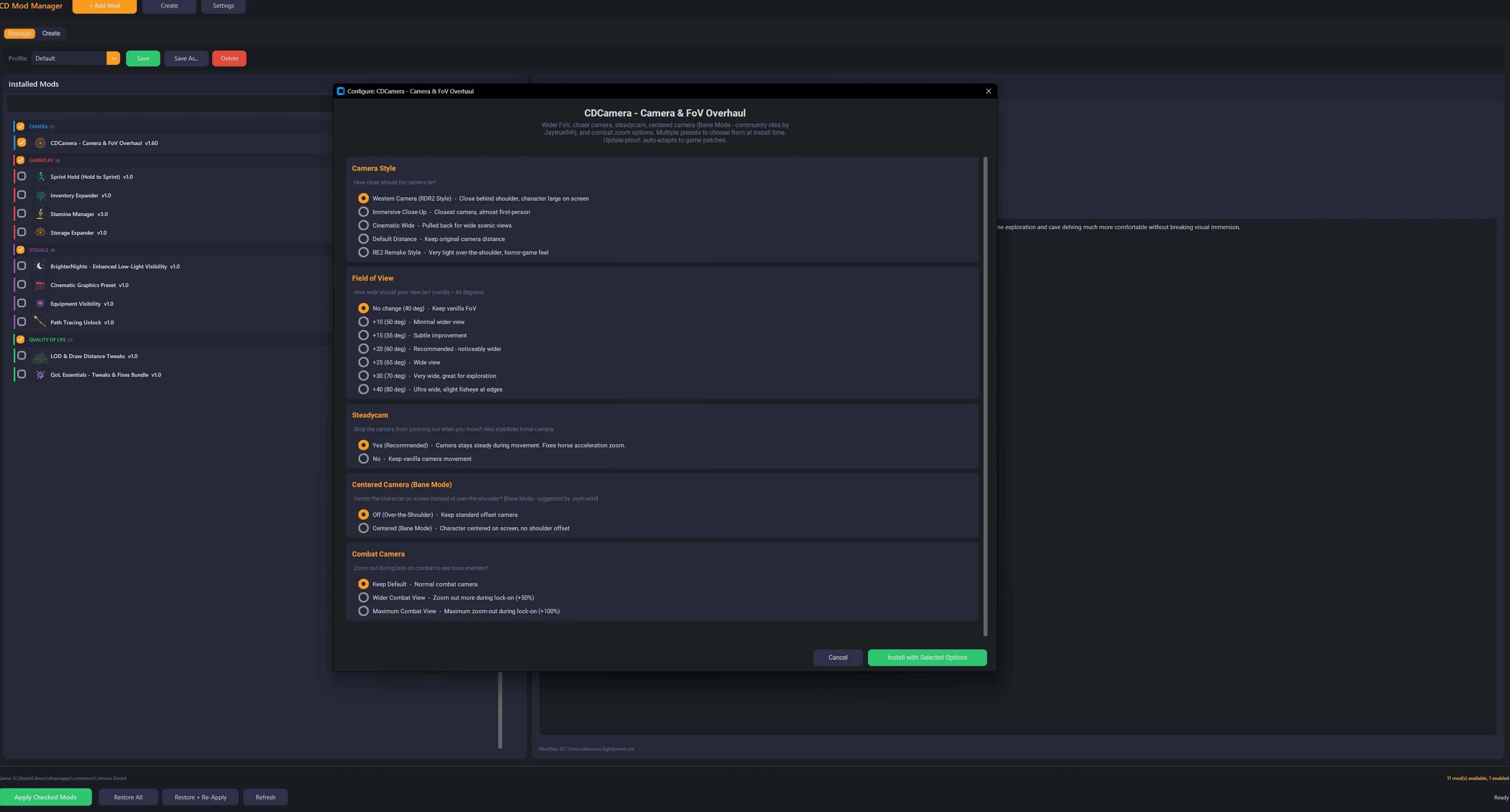 – 8 Camera Styles: Western (RDR2), Immersive (closest), Cinematic (wide), RE2 Remake (horror-style), Lower Camera (Witcher 3/GOW), Very Low, Ultra Low, Steady