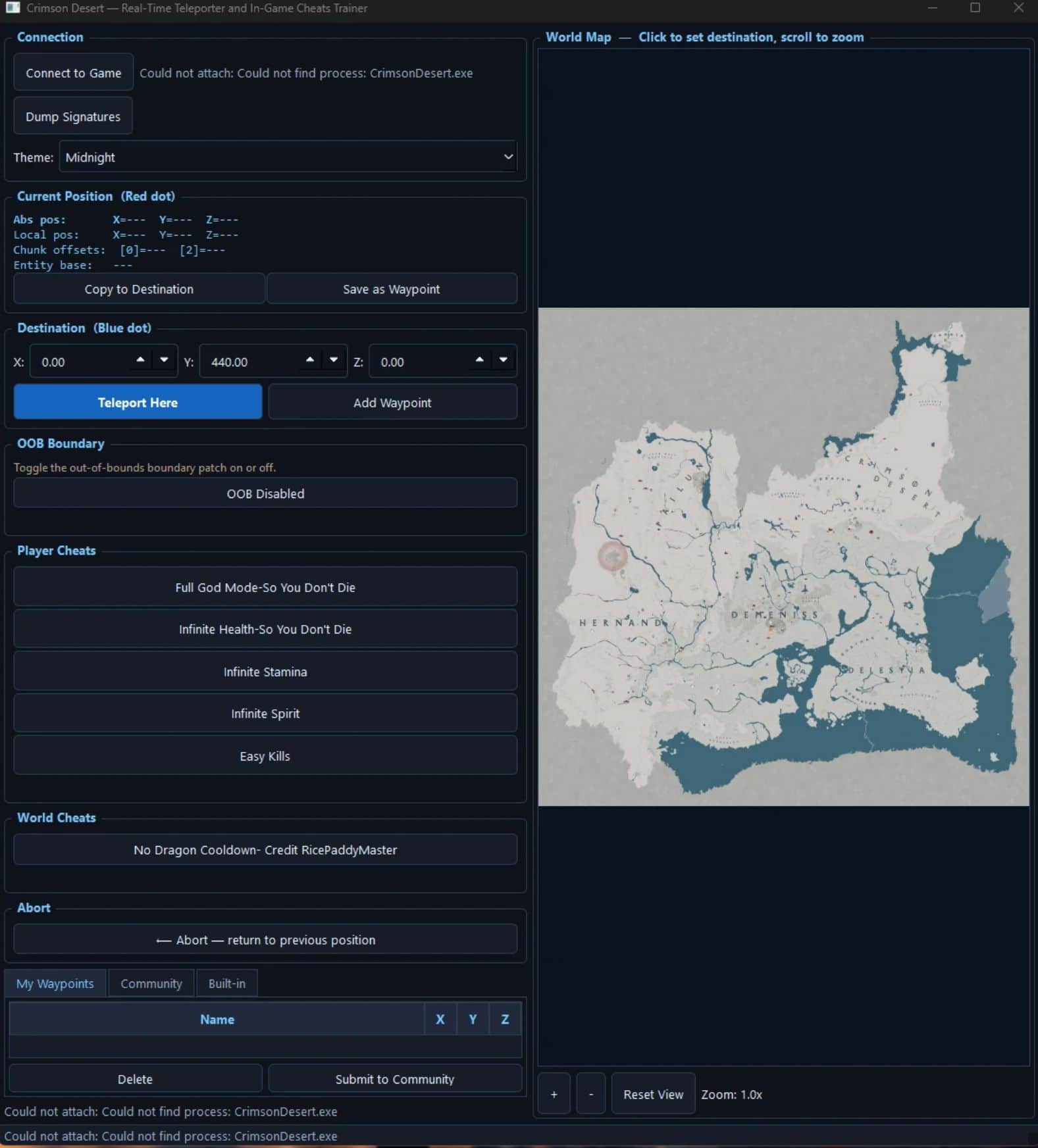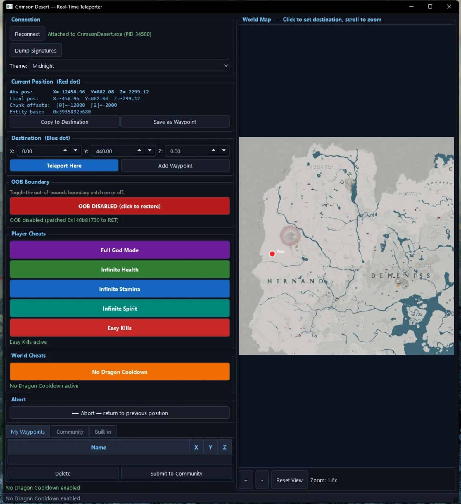 A lightweight standalone tool that provides real-time teleportation, player cheats, and world tweaks for Crimson Desert.Built for stability and usability β no Cheat Engine required.