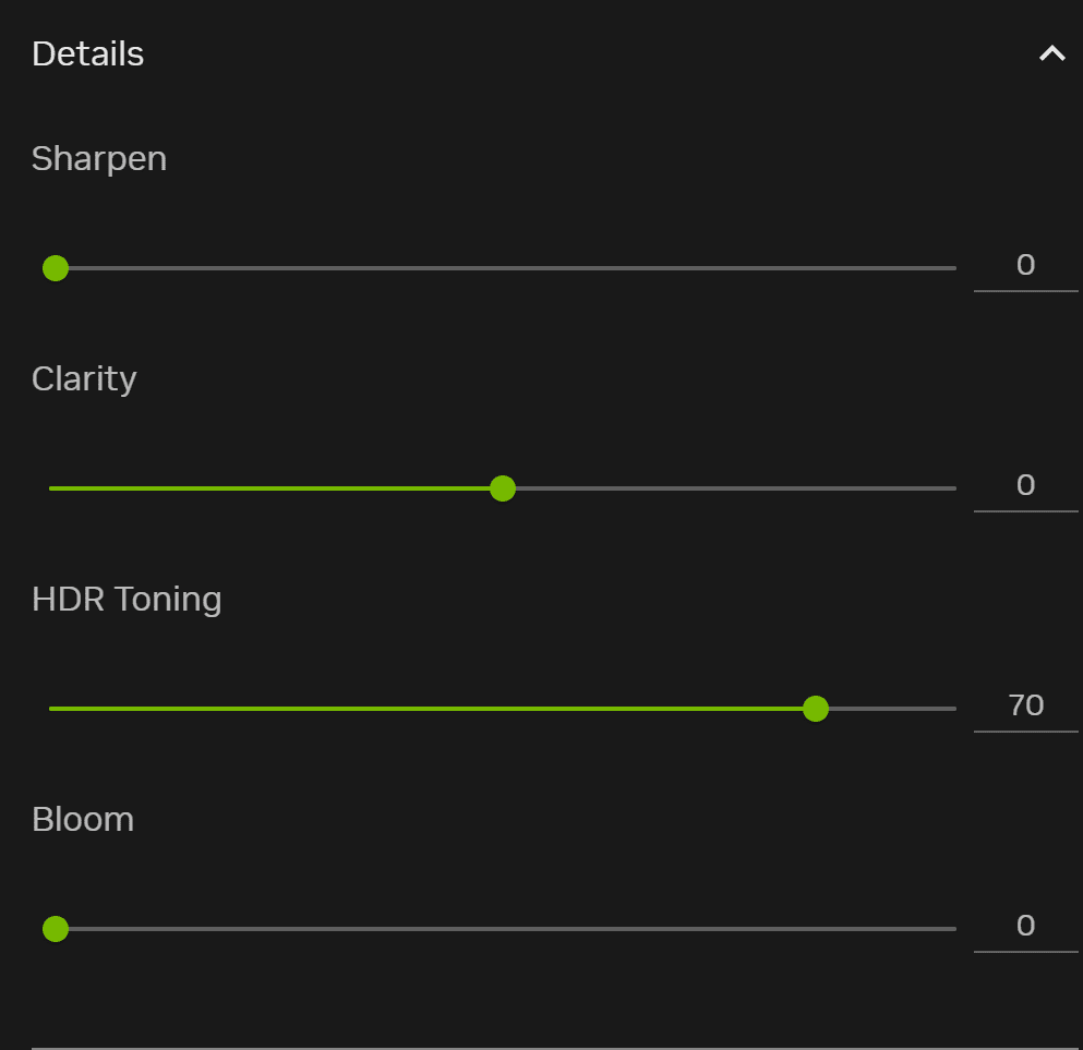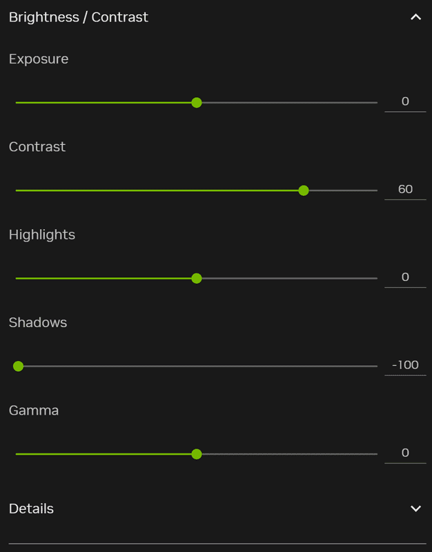 – Add “Brightness/Contrast” & “Details” filters in sequence, adjust as reference