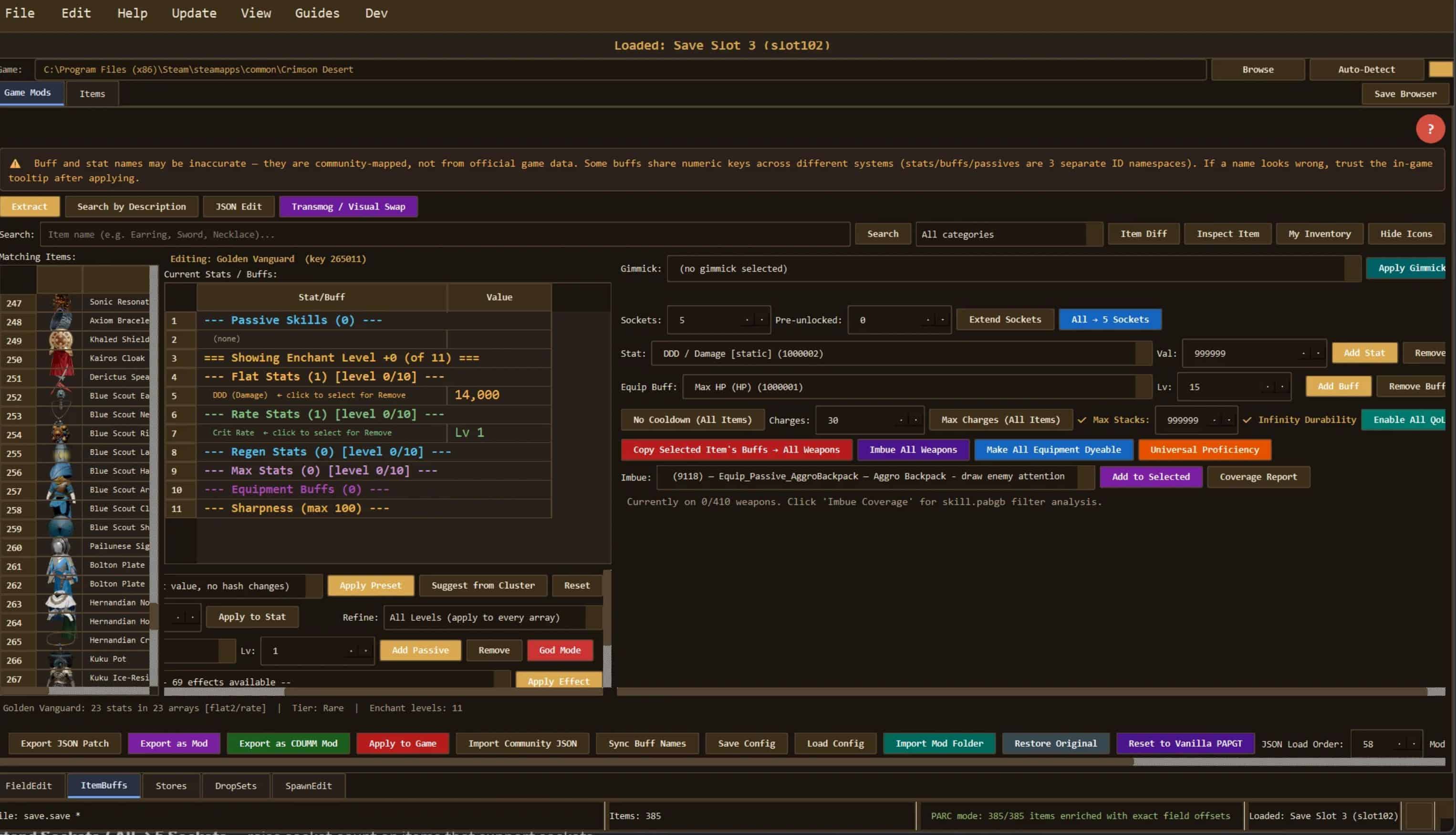– Copy Selected Item’s Buffs → All Weapons — Broadcast the current item’s equip_buffs onto every weapon. Merges dupes; higher level wins.