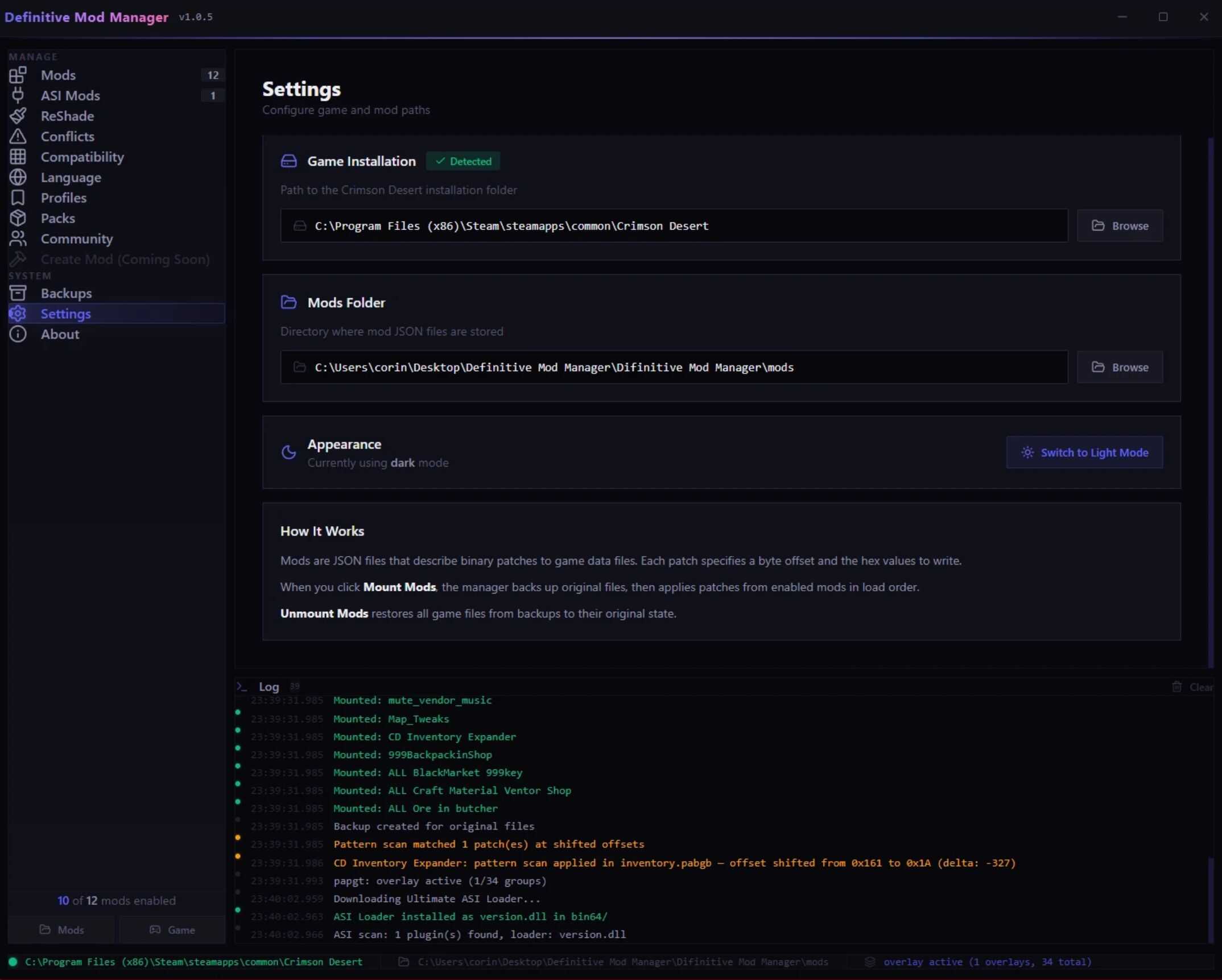 Definitive Mod Manager (DMM) is a free, open-source mod manager for Crimson Desert. It handles every mod format in one application: JSON patches, textures, file replacements, UI mods, audio mods, ASI plugins, ReShade, and more. No other Crimson Desert mod tool supports this many formats in a single program.