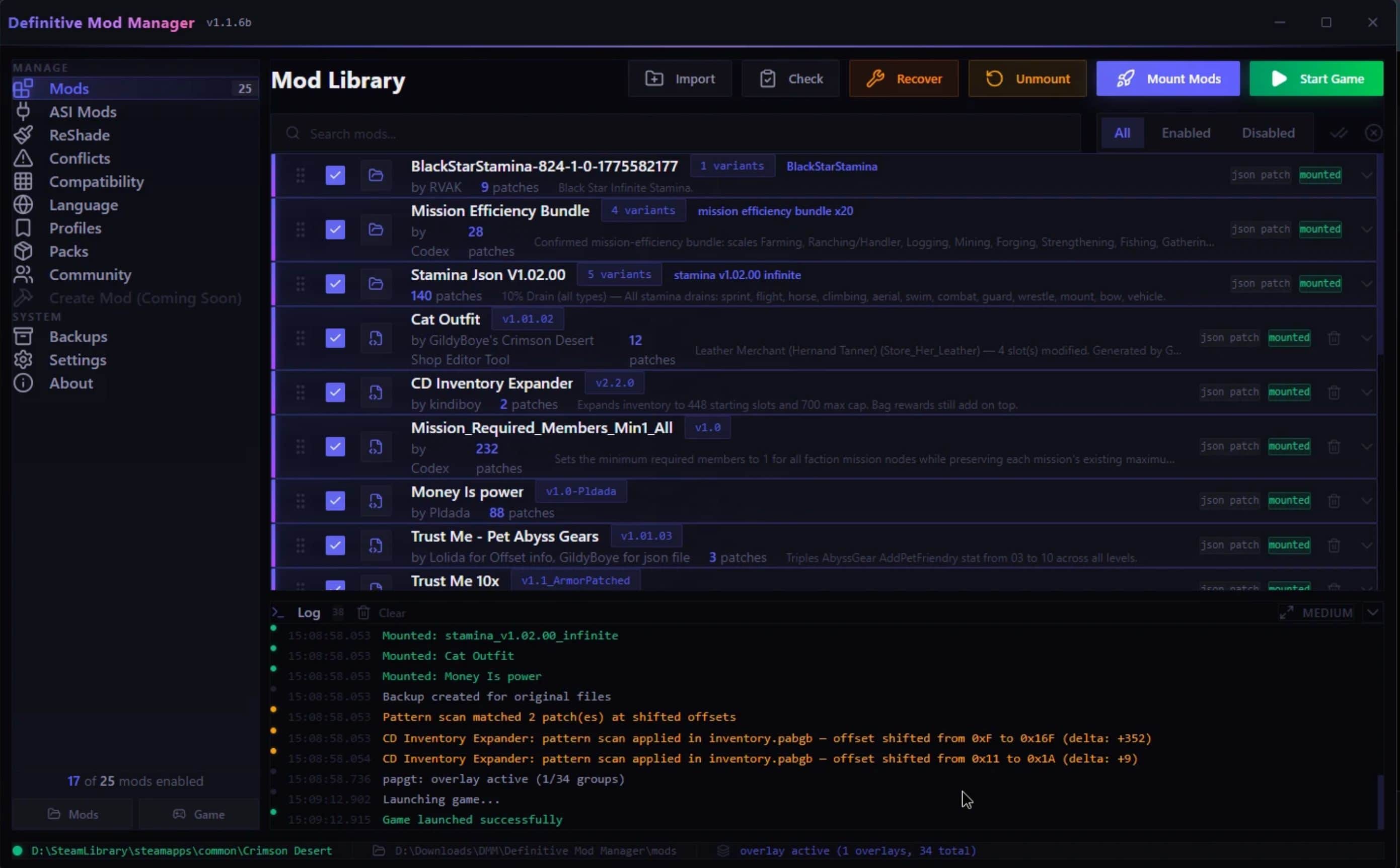 – Drop your Crimson Desert mods into the mods folder, enable them, and click Mount