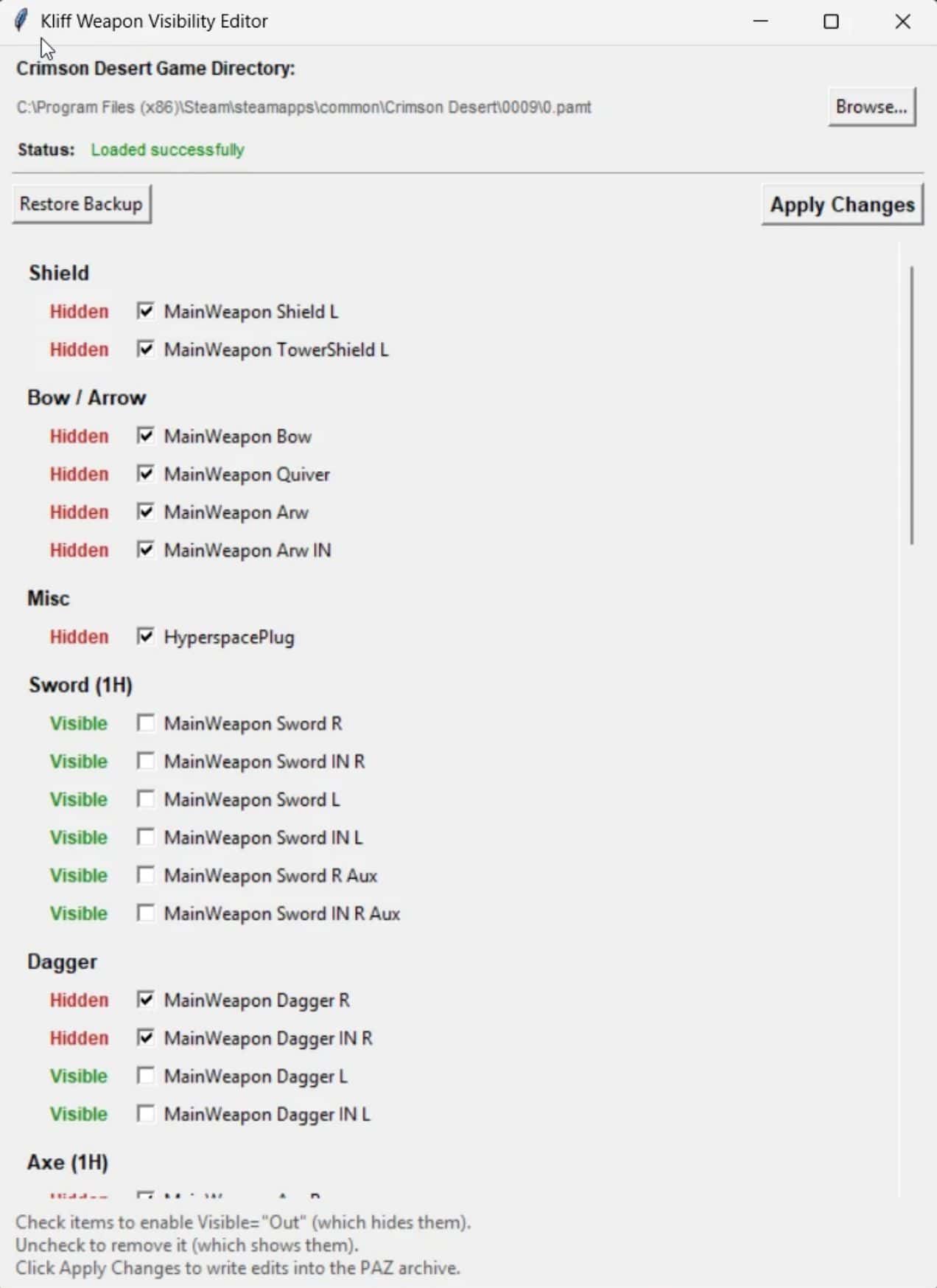 – Simple checklist interface to hide specific weapons (Shields, Bows, Swords, Tools, etc.) or everything at once.