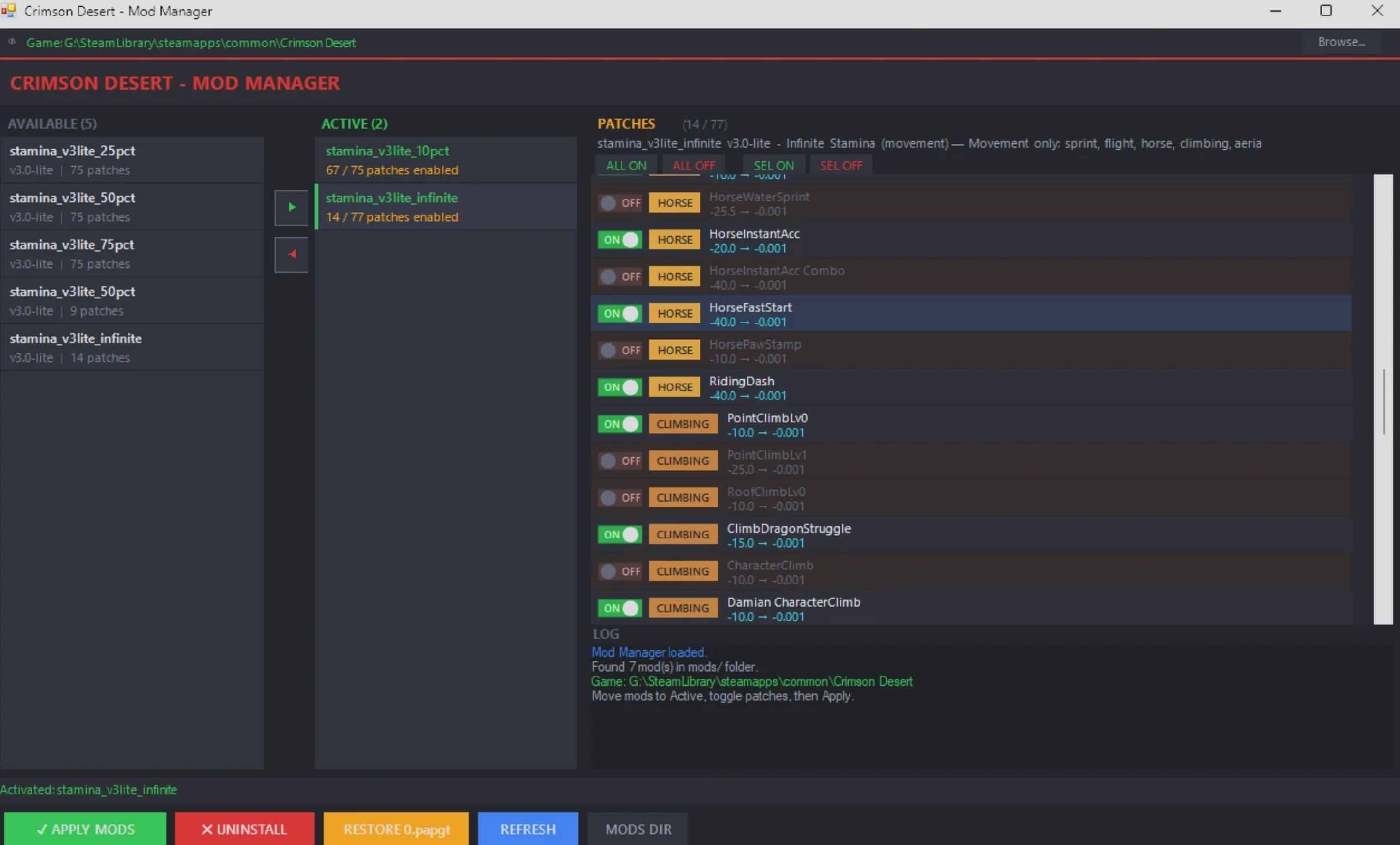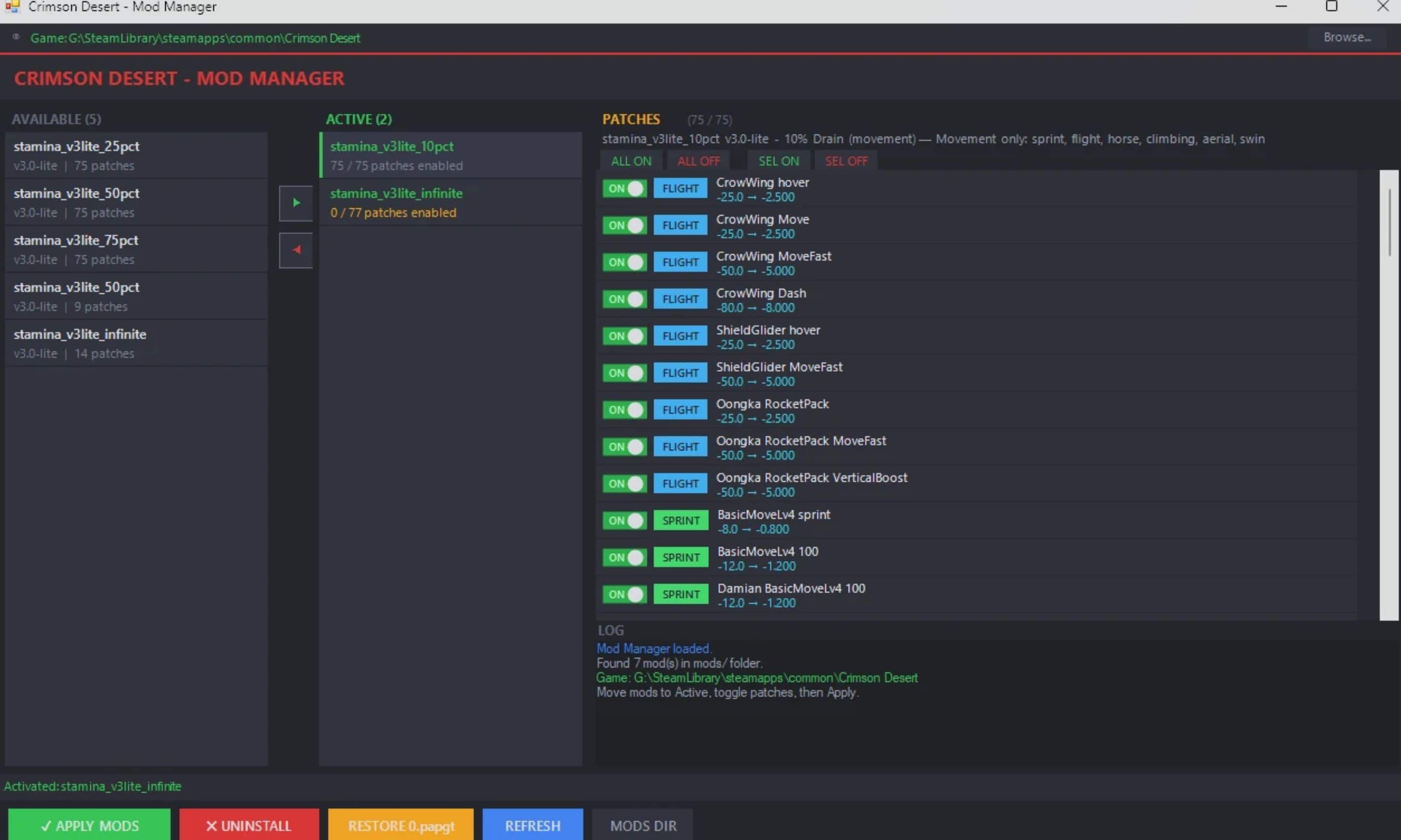 – The GUI will auto-detect your Crimson Desert install (Steam). If not found, click Browse to set it manually