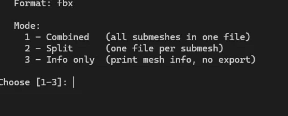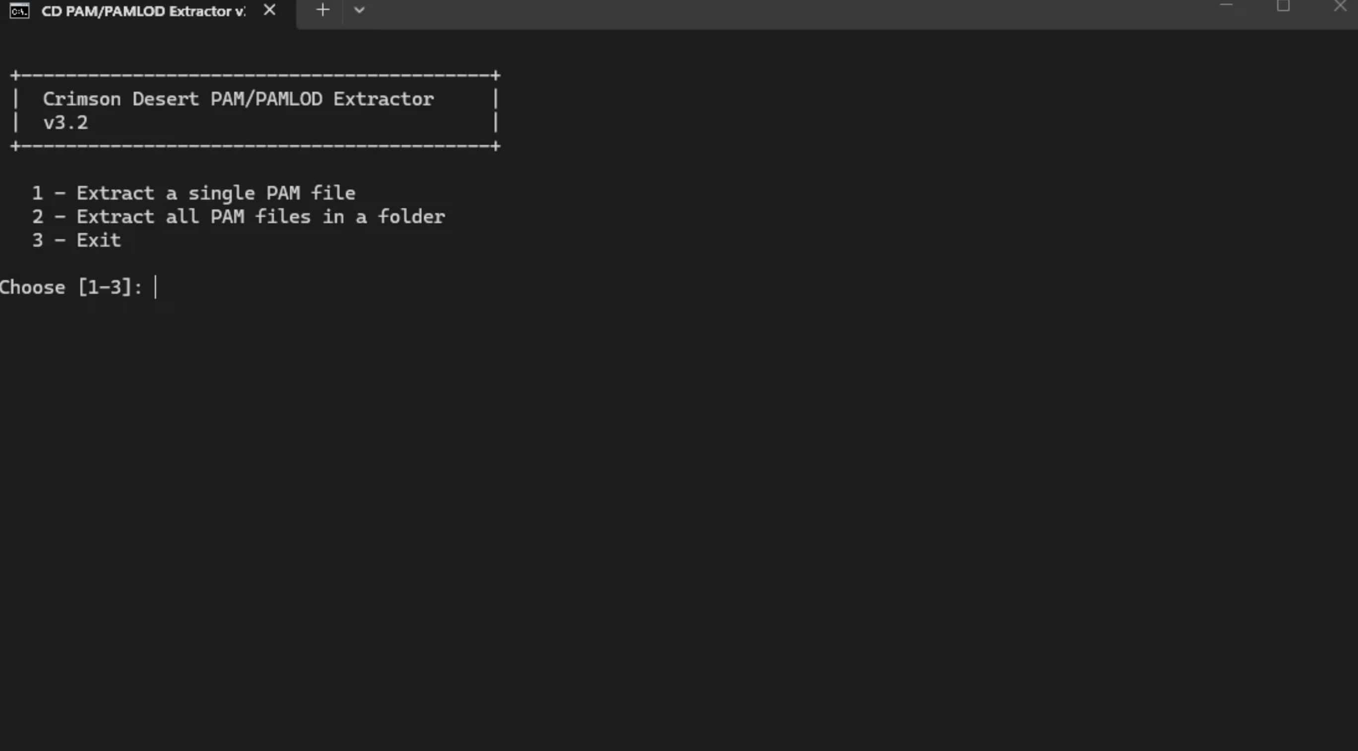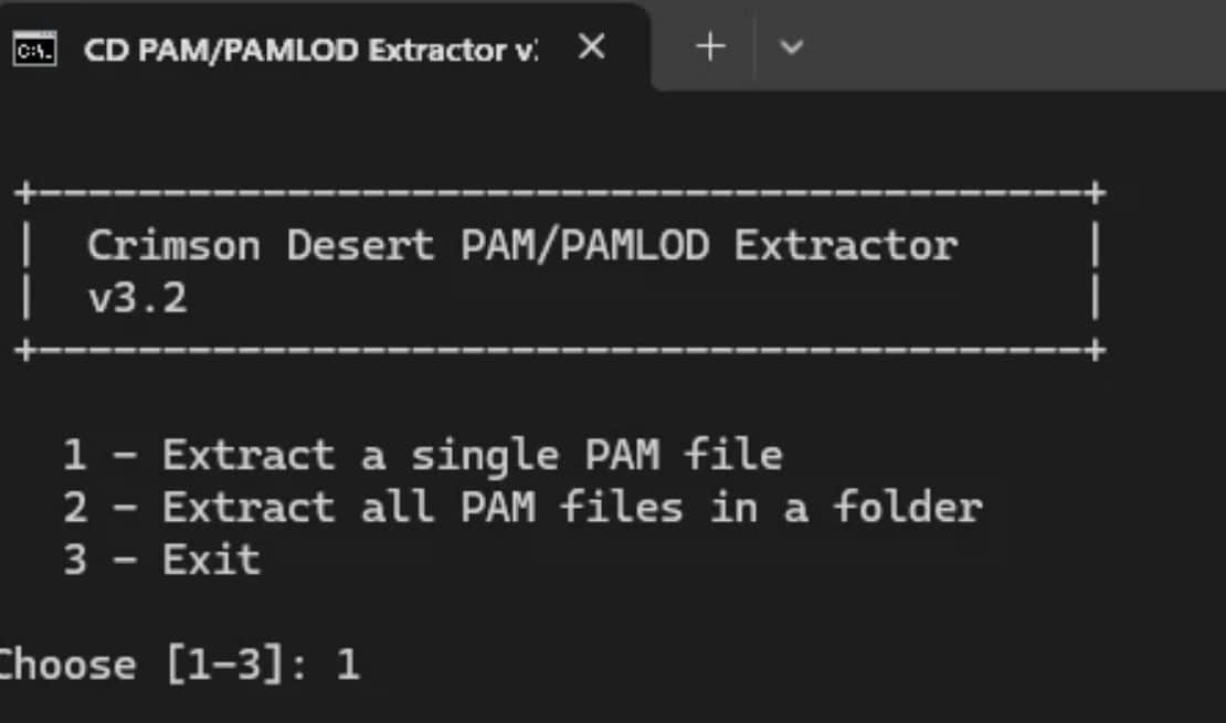 Double-click to extract. Choose whether you want to work with a single file or an entire folder. Select the PAM file you want to extract, then choose the desired output format. After that, you can choose whether you want all meshes to be separated or joined, and the script will start working.
